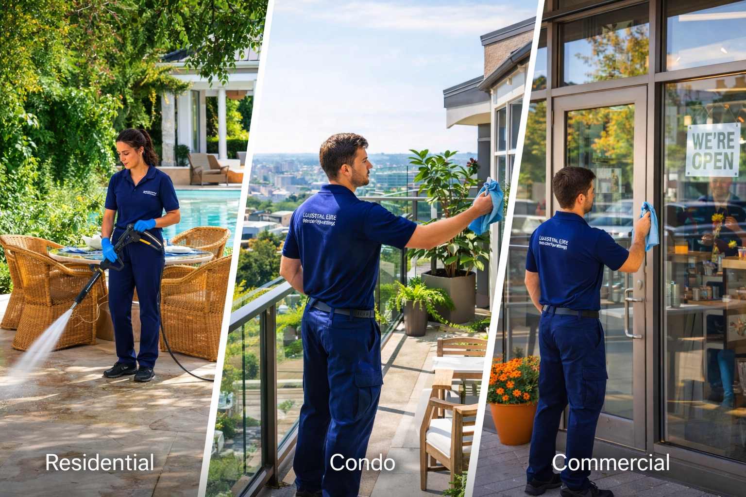 Chez Lustral Elite, nous proposons des services d’entretien extérieur et de nettoyage saisonnier conçus pour préserver la propreté et l’élégance de vos espaces extérieurs. Qu’il s’agisse d’une résidence, d’un condo, d’un immeuble ou d’un espace commercial, notre équipe assure un entretien soigné des patios, terrasses, balcons et entrées afin de préparer votre propriété pour chaque saison et offrir un environnement propre, accueillant et impeccable.